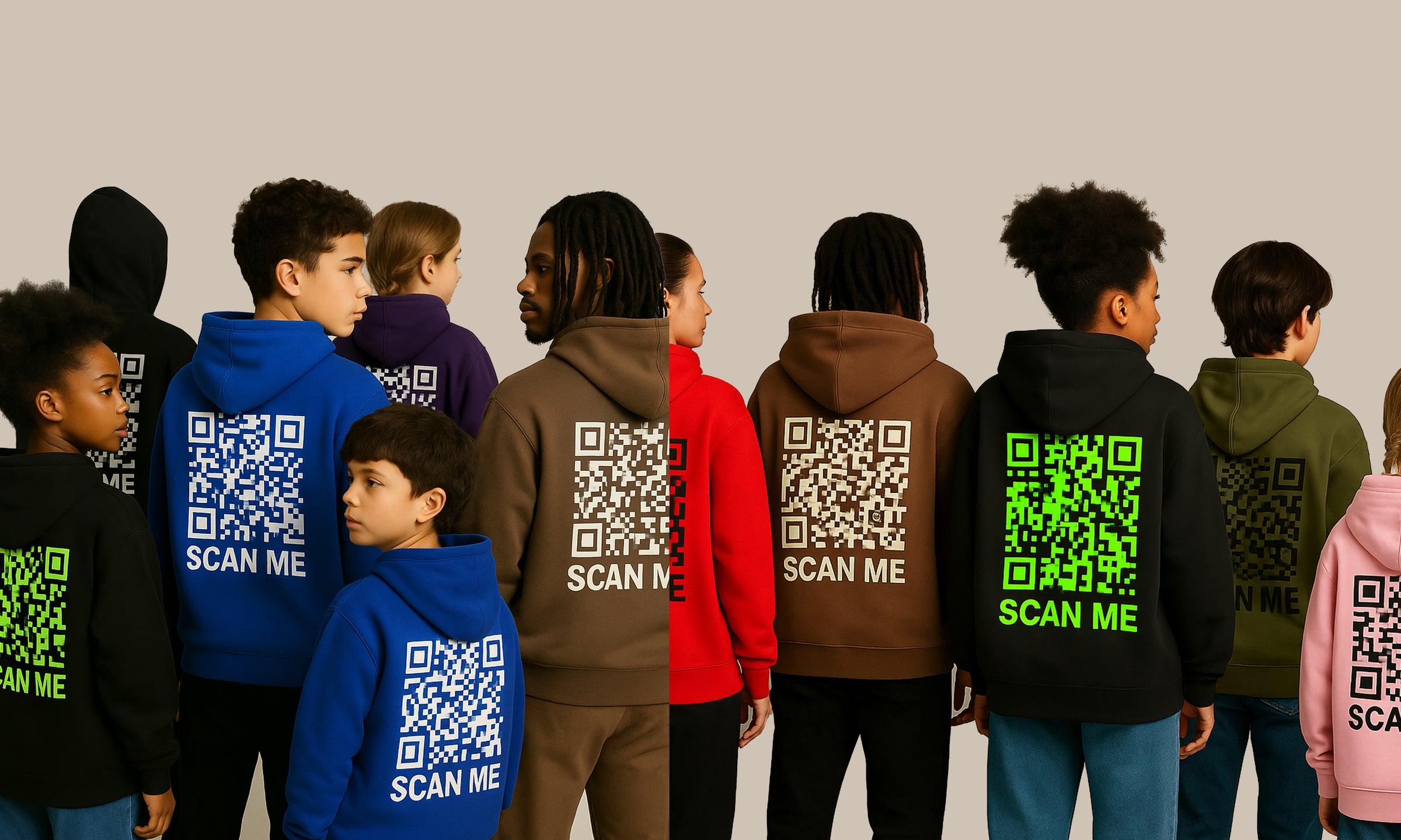 Each sweatshirt has a scannable QR code that unlocks a hidden Shopify page with rotating positive affirmations and a secret discount.